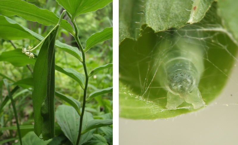I stashed this leaf in a container I had handy at the moment, and by the time I got home the larva had already drawn together the leaf margins with silk, creating a tubelike feeding shelter.